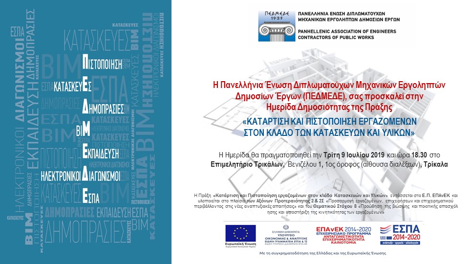 Ο Πρόεδρος της Διοικούσας Επιτροπής του Περιφερειακού Τμήματος Κεντρικής και Δυτικής Θεσσαλίας του ΤΕΕ κ. Νικόλαος Παπαγεωργίου & ο Πρόεδρος του Περιφερειακού Τμήματος ΠΕΔΜΕΔΕ Δυτικής Θεσσαλίας κ. Κωνσταντίνος Πλιάτσικας συνδιοργανώνουν ενημερωτική Ημερίδα την Τρίτη 9 Ιουλίου 2019 και ώρα 18.30 στο Επιμελητήριο Τρικάλων (Αίθουσα διαλέξεων – 1ος όροφος) στα Τρίκαλα (Βενιζέλου 1), προκειμένου να ενημερωθούν όλοι οι ωφελούμενοι για τα προγράμματα κατάρτισης, τις προϋποθέσεις συμμετοχής και τη διαδικασία υποβολής αίτησης, δεδομένου ότι έχει ανοίξει η πλατφόρμα στην ιστοσελίδα της ΠΕΔΜΕΔΕ για την υποβολή αίτησης συμμετοχής στο Πρόγραμμα ΕΣΠΑ «Κατάρτιση και Πιστοποίηση εργαζομένων στον κλάδο κατασκευών και υλικών».