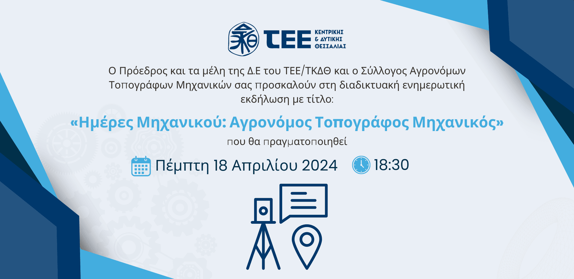 Το ΤΕΕ/ΤΚΔΘ και ο Σύλλογος Αγρονόμων Τοπογράφων Μηχανικών διοργανώνουν μια ιδιαίτερα ενδιαφέρουσα, διαδικτυακή, ενημερωτική εκδήλωση με τίτλο: «Ημέρες Μηχανικού: Αγρονόμος Τοπογράφος Μηχανικός» που θα πραγματοποιηθεί την Πέμπτη 18 Απριλίου, στις 18:30.