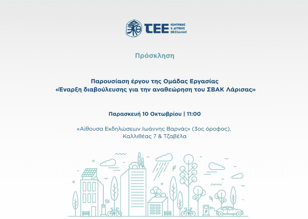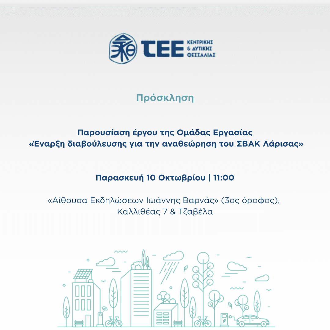 Το Περιφερειακό Τμήμα Κεντρικής και Δυτικής Θεσσαλίας του ΤΕΕ σας προσκαλεί σε ενημερωτική εκδήλωση στην οποία θα παρουσιαστούν τα αποτελέσματα της διαβούλευσης για την αναθεώρηση του Σχεδίου Βιώσιμης Αστικής Κινητικότητας (ΣΒΑΚ) Λάρισας.