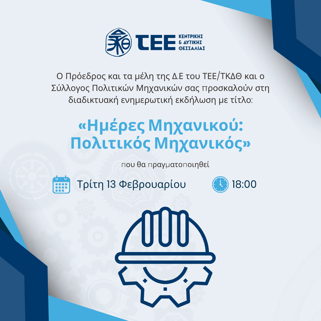 Το ΤΕΕ/ΤΚΔΘ και ο Σύλλογος Πολιτικών Μηχανικών διοργανώνουν μια ιδιαίτερα ενδιαφέρουσα, διαδικτυακή, ενημερωτική εκδήλωση με τίτλο: «Ημέρες Μηχανικού: Πολιτικός Μηχανικός» που θα πραγματοποιηθεί την Τρίτη 13 Φεβρουαρίου, στις 18:00.