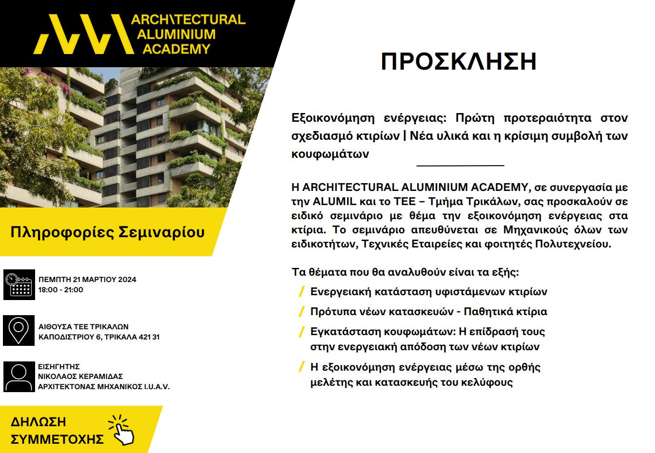 Η ARCHITECTURAL ALUMINIUM ACADEMY, σε συνεργασία με την ALUMIL και το ΤΕΕ/ΤΚΔΘ – Ν.Ε. Τρικάλων, σας προσκαλούν σε ειδικό σεμινάριο με θέμα την εξοικονόμηση ενέργειας στα κτίρια, που θα πραγματοποιηθεί την Πέμπτη 21 Μαρτίου 2024 and time 18.00 – 21.00, στα Γραφεία της Ν.Ε. Τρικάλων, Καποδιστρίου 6, Τρίκαλα.
