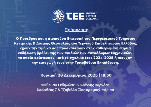 Ο Πρόεδρος και η Διοικούσα Επιτροπή του Περιφερειακού Τμήματος Κεντρικής & Δυτικής Θεσσαλίας του Τεχνικού Επιμελητηρίου Ελλάδος, έχουν την τιμή να σας προσκαλέσουν στην καθιερωμένη ετήσια εκδήλωση βράβευσης των παιδιών των συναδέλφων Μηχανικών, τα οποία αρίστευσαν κατά το σχολικό έτος 2024-2025 ή πέτυχαν την εισαγωγή τους στην Τριτοβάθμια Εκπαίδευση.