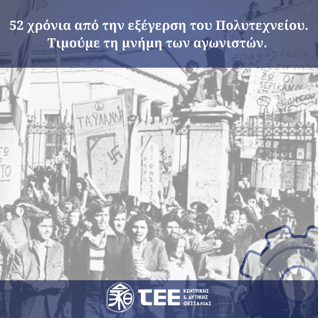 Το ΤΕΕ/Τμήμα Κεντρικής & Δυτικής Θεσσαλίας, τιμώντας τους αγωνιστές του Πολυτεχνείου, δεσμεύεται να παραμείνει πιστό στις αρχές που εκείνοι υπηρέτησαν. Ως τεχνικοί σύμβουλοι της Πολιτείας και ως ενεργοί πολίτες, θα συνεχίσουμε να πρωτοπορούμε, υπερασπιζόμενοι το δημόσιο συμφέρον, την αξιοκρατία, τη διαφάνεια και την επιστημονική αλήθεια, ως ελάχιστο φόρο τιμής σε όσους θυσιάστηκαν για έναν κόσμο ελεύθερο και δίκαιο.