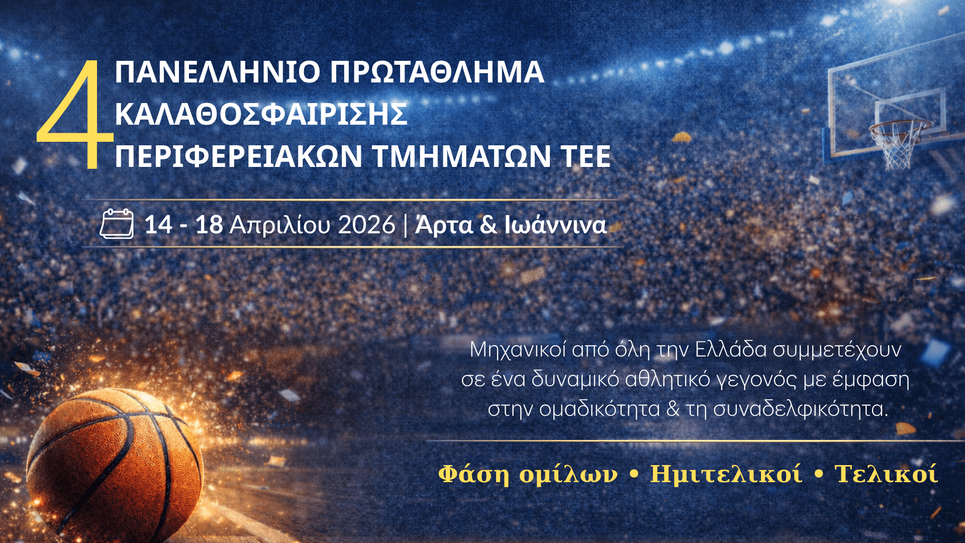 Το 4ο Πανελλήνιο Πρωτάθλημα Καλαθοσφαίρισης Περιφερειακών Τμημάτων ΤΕΕ θα πραγματοποιηθεί από τις 14 έως τις 18 Απριλίου 2026, στις πόλεις της Άρτας και των Ιωαννίνων.