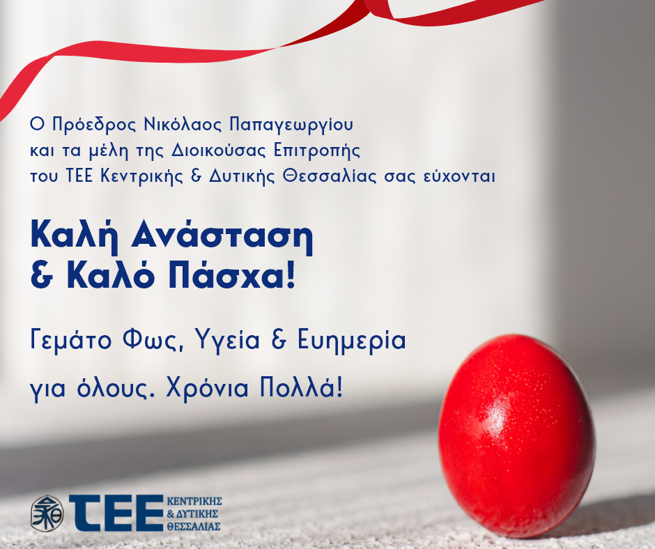 Εκ μέρους της Διοικούσας Επιτροπής και του ανθρώπινου δυναμικού του ΤΕΕ Κεντρικής & Δυτικής Θεσσαλίας, εύχομαι σε όλες και σε όλους σας καλή Ανάσταση και καλό Πάσχα με υγεία και δύναμη.