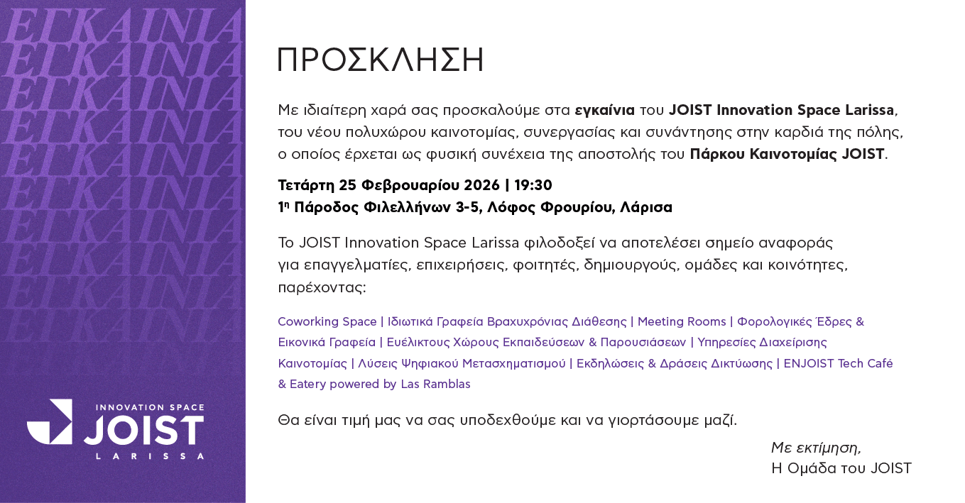 Το Πάρκο Καινοτομίας JOIST σας προσκαλεί στα εγκαίνια του JOIST Innovation Space Larissa, του νέου πολυχώρου καινοτομίας, συνεργασίας και συνάντησης στην καρδιά της πόλης, την Τετάρτη 25 Φεβρουαρίου 2026, στις 19:30.